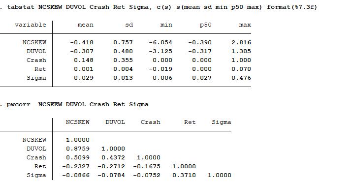 二是采用收益率上下波动比率(DUVOL)度量股价崩盘风险。 对于每个公司、季度,首先定义特质收益率小于均值的日为下跌日,特质收益率高于均值的日为上涨日。然后分别计算出下跌日和上涨日特质收益率的标准差,得出下跌波动率和上涨波动率。 最后,以下跌波动率除以上涨波动率并取自然对数,即得到每一个公司、季度样本的 DUVOL 指标。 计算公式如下: