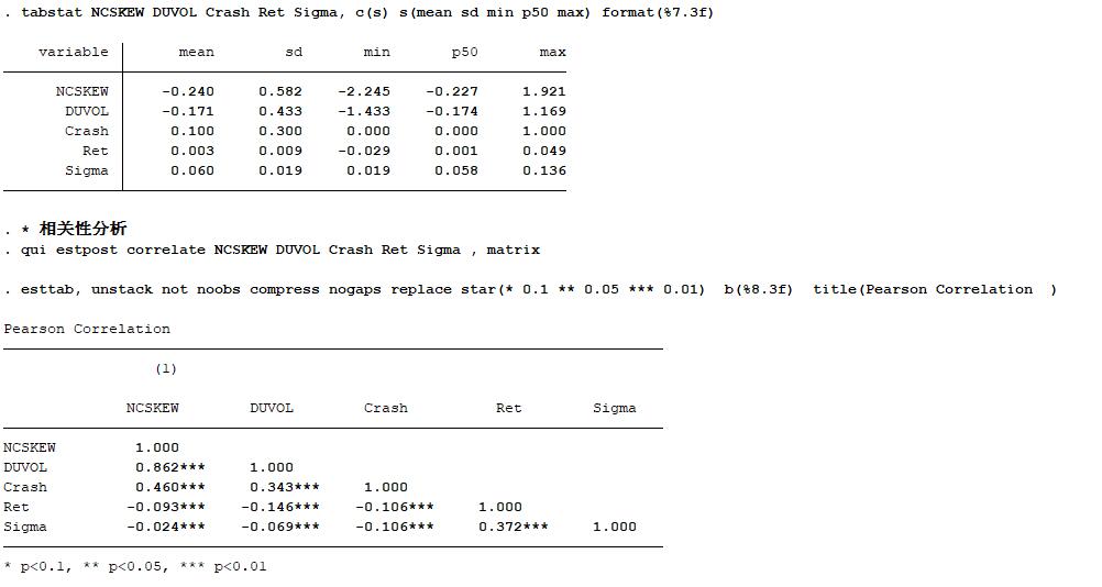 二是采用收益率上下波动比率(DUVOL)度量股价崩盘风险。 对于每个公司、年度,首先定义特质收益率小于均值的周为下跌周,特质收益率高于均值的周为上涨周。然后分别计算出下跌周和上涨周特质收益率的标准差,得出下跌波动率和上涨波动率。 最后,以下跌波动率除以上涨波动率并 取自然对数,即得到每一个公司、年度样本的 DUVOL 指标。 计算公式如下:
