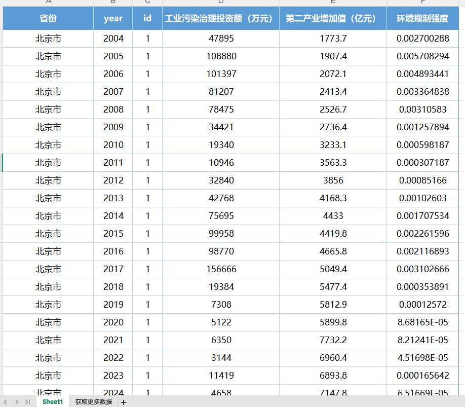 31省份环境规制强度/工业污染治理完成投资/第二产业增加值,2004-2024年,含原始数据、测算方法、参考文献,整理好的面板数据,excel版
