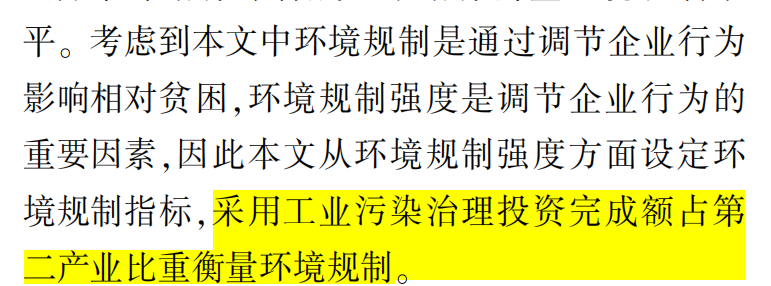 参考发表于核心期刊《中国软科学》中刘荣增(2021)、《数量经济技术经济研究》中胡洁(2023)的做法,利用工业污染治理投资完成额占第二产业比重衡量环境规制