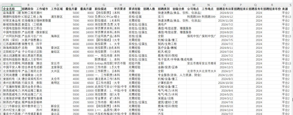 团队采用大数据方法爬取了来自前程无忧、BOSS、智联招聘、猎聘网、拉勾网、看准网等国内主流招聘网站历年发布的全部招聘岗位。根据职位描述、经验要求筛选应届生招聘数据2014-2024年。经过处理,获得大约700万个有效的应届生招聘岗位,是有一定价值的研究资料。我们相信后续这一数据会得到更为广泛的应用,为相关领域研究提供坚实的数据支撑