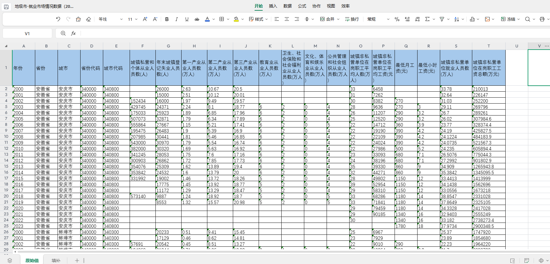 包含指标:年份 省份 城市 省份代码 城市代码 城镇私营和个体从业人员数(人) 年末城镇登记失业人员数(人) 第一产业从业人员数(万人) 第二产业从业人员数(万人) 第三产业从业人员数(万人) 教育业从业人员数(万人) 卫生、社会保险和社会福利业从业人员数(万人) 文化、体育和娱乐业从业人员数(万人) 公共管理和社会组织从业人员数(万人) 城镇非私营单位在岗职工平均人数(万人) 城镇非私营单位在岗职工平均工资(元) 最低月工资(元) 最低小时工资(元) 城镇非私营单位就业人员数(万人) 城镇非私营单位在岗职工工资总额(万元)