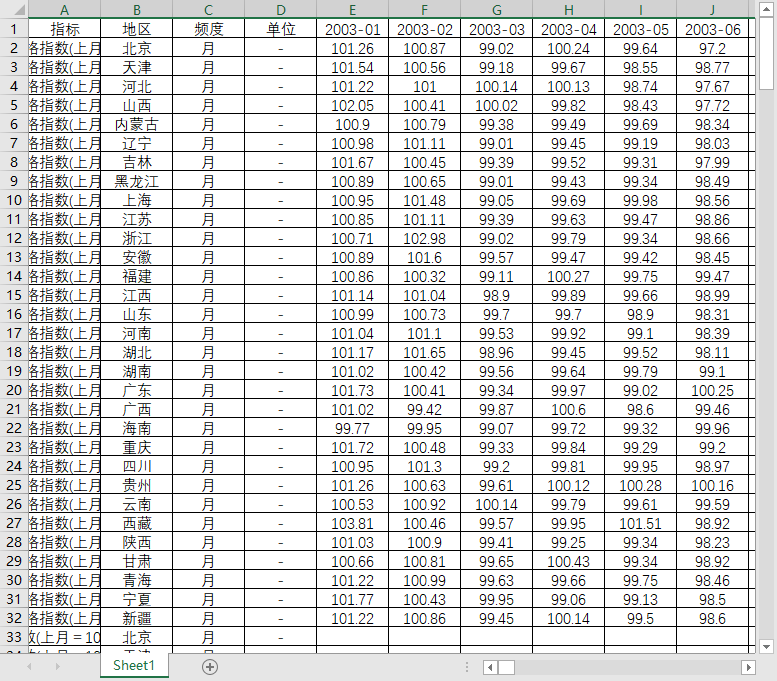 全国31个省份居民消费价格指数CPI环比(上月=100)2003-202601食品衣着居住生活用品交通通信教育文化医疗保健等