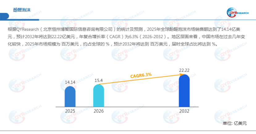 根据QYResearch(北京恒州博智国际信息咨询有限公司)的权威统计与精准预测,2025年全球酚醛泡沫市场销售额已然达到14.14亿美元,这一数据彰显出该市场已具备相当规模。而展望未来,预计到2032年,这一数字将攀升至22.22亿美元,2026 - 2032年期间年复合增长率(CAGR)高达6.3%。如此强劲的增长态势,无疑为全球酚醛泡沫市场勾勒出一幅充满希望的发展蓝图。