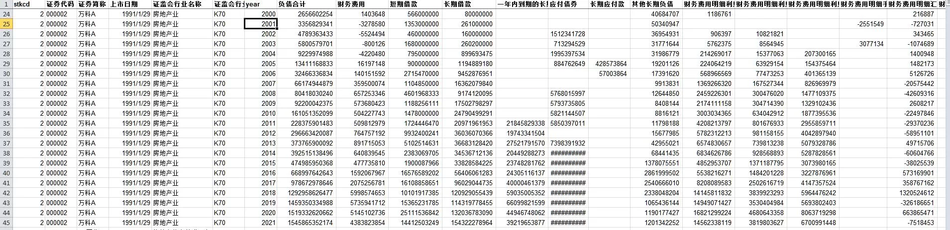 stkcd 证券代码 证券简称 上市日期 证监会行业名称 证监会行业代码 year 负债合计 财务费用 短期借款 长期借款 一年内到期的长期借款 应付债券 长期应付款 其他长期负债 财务费用明细利息支出 财务费用明细利息收入 财务费用明细利息资本化金额 财务费用明细手续费 财务费用明细汇兑损益 财务费用明细其他