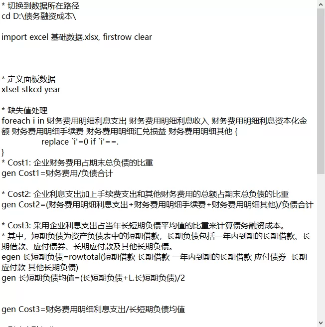 - Cost3: 采用企业利息支出占当年长短期负债平均值的比重来计算债务融资成本。其中,短期负债为资产负债表中的短期借款,长期负债包括一年内到期的长期借款、长期借款、应付债券、长期应付款及其他长期负债。