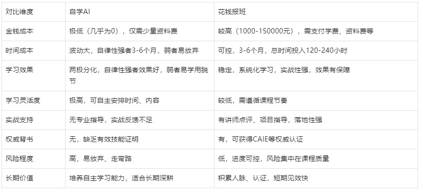 3. 最优组合模式:基础内容(AI认知、Prompt入门、简单工具)自学,核心内容(RAG构建、实战落地)报班,既节省成本,又能保证学习效果。