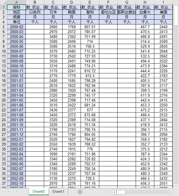 经合组织部分国家地区就业人员数2000-2025农林牧渔业工业服务业建筑业等