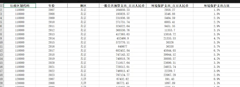 本次分享的数据为中国31个省份环境保护支出数据,范围为2007-2023年