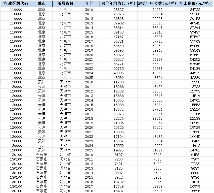 全国300+城市房价数据(2010-2025年)