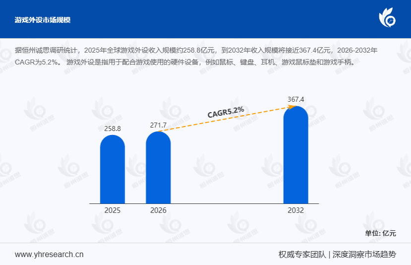 在数字化娱乐产业蓬勃发展的当下,游戏外设作为提升游戏体验的关键硬件设备,其市场规模持续扩张。据恒州诚思调研统计,2025年全球游戏外设收入规模约达258.8亿元,预计到2032年,这一数字将接近367.4亿元,2026 - 2032年复合增长率(CAGR)为5.2%。这一增长态势反映出游戏外设市场蕴含着巨大的发展潜力,吸引着众多企业与投资者的关注。