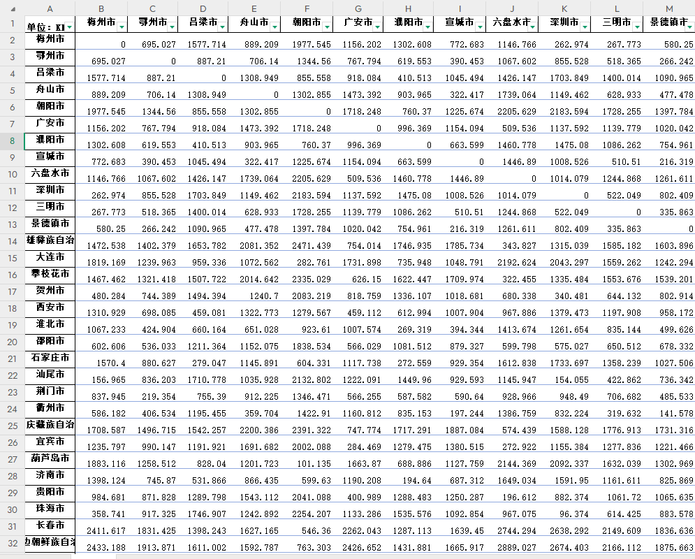 【数据简介】中国城市间地理距离矩阵数据集,通过审图号GS(2024)0650的中国城市地图在Albers投影坐标系中进行计算得出矩阵表格,单位为KM,方便大家研究使用。中国城市地理距离矩阵数据通过计算城市中心距离构建地理矩阵,可用于工具变量设计(如到杭州的距离)、物流成本评估及环境治理分析,为学术与政策提供量化依据。