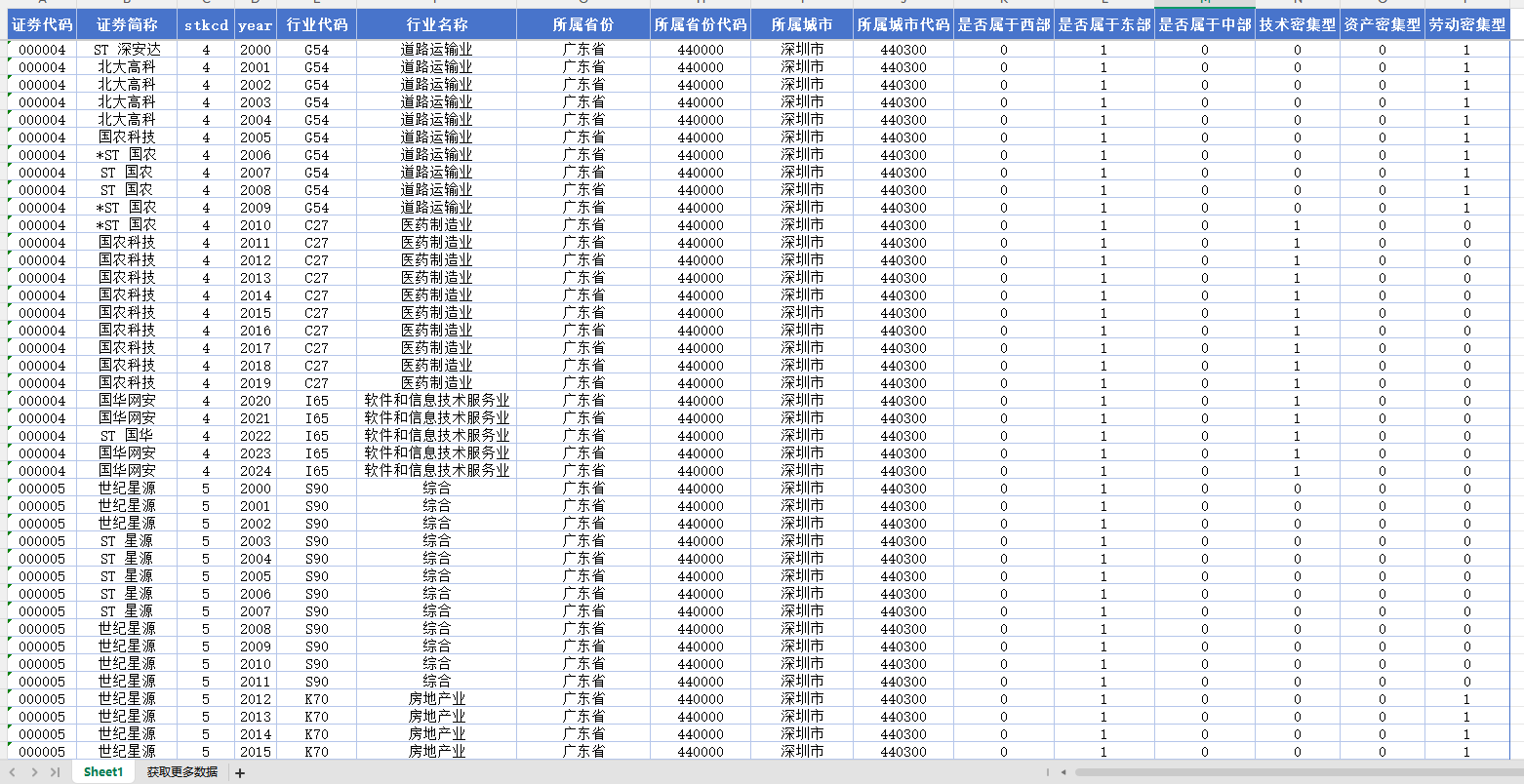 证券代码 证券简称 stkcd year 行业代码 行业名称 所属省份 所属省份代码 所属城市 所属城市代码 是否属于西部 是否属于东部 是否属于中部 技术密集型 资产密集型 劳动密集型