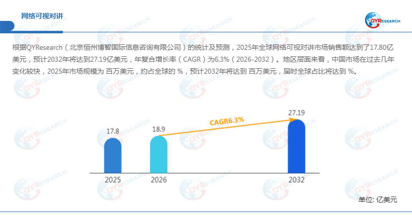 根据QYResearch(北京恒州博智国际信息咨询有限公司)的统计及预测,2025年全球网络可视对讲市场销售额达到了17.80亿美元,预计2032年将达到27.19亿美元,年复合增长率(CAGR)为6.3%(2026-2032)。