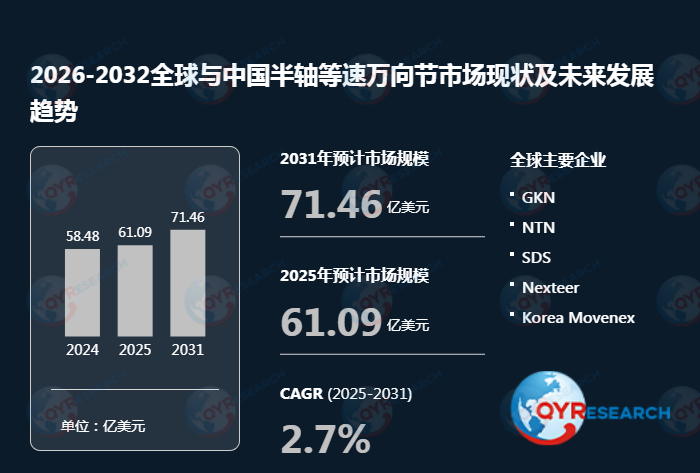 QYResearch调研显示,2025年全球半轴等速万向节市场规模大约为61.09亿美元,预计2032年将达到73.17亿美元,2026-2032期间年复合增长率(CAGR)为2.7%。