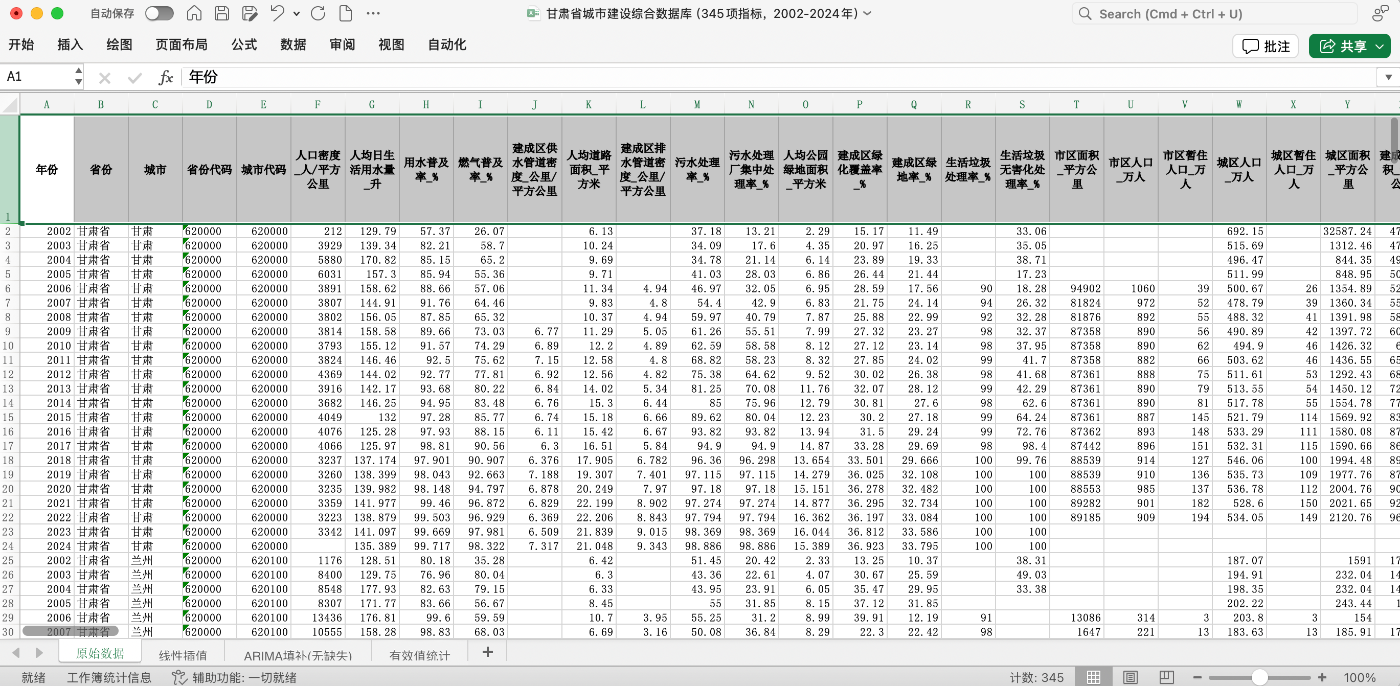 甘肃省城市建设数据库(省级+地级市+县级市面板数据,345项城市建设指标,2002-2024年)