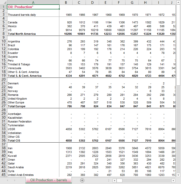 全球世界各国地区原油、原油和凝析油、天然气凝析液产量1965-2024生产量
