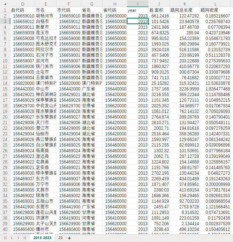 相关变量:FID、Shape *、县名、县代码、市名、市代码、省名、省代码、年份、县.面积、路网总长度、路网密度。