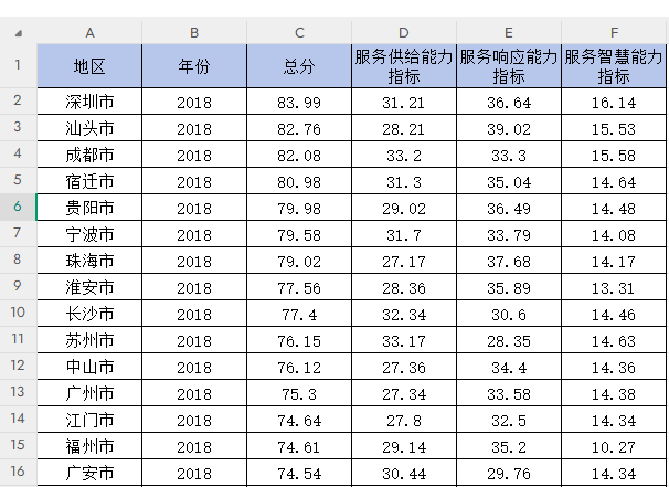 数据指标:地区、年份、总分、服务供给能力指标、服务响应能力指标、服务智慧能力指标。