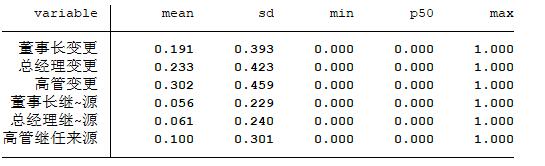 高管继任来源:若总经理或董事长继任者来自外部取1, 否则0