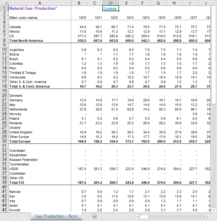 全球世界各国地区天然气:产量消费量消耗量1970-2024