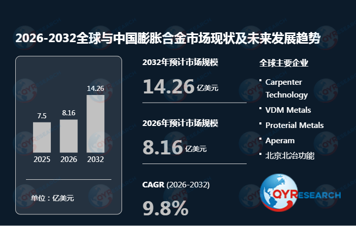 根据QYResearch(北京恒州博智国际信息咨询有限公司)的统计及预测,2025年全球膨胀合金市场销售额达到了7.5亿美元,预计2032年将达到14.26亿美元,年复合增长率(CAGR)为9.8%(2026-2032)。