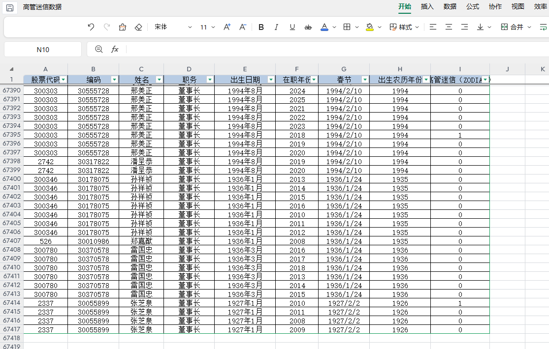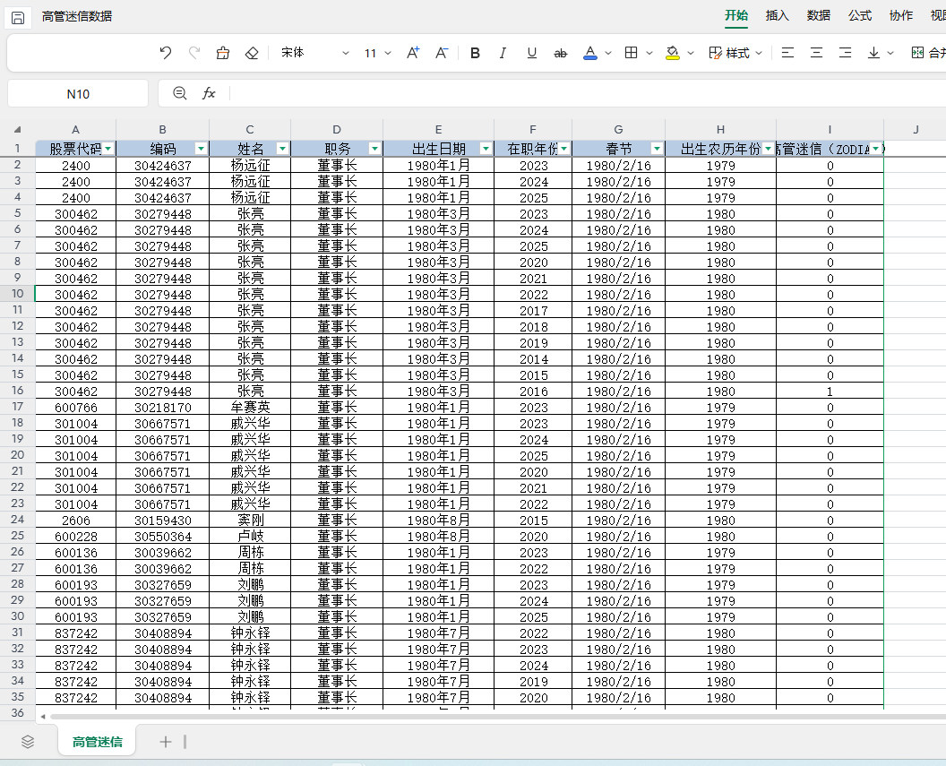 包含指标:股票代码 编码 姓名 职务 出生日期 在职年份 春节 出生农历年份 高管迷信(ZODIAC)