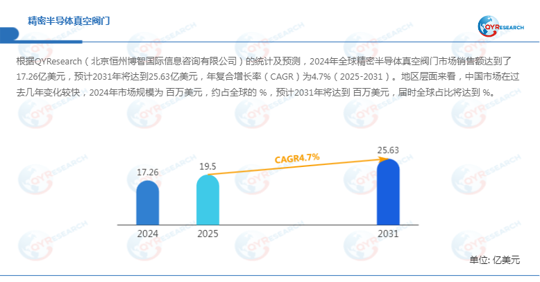 根据QYResearch最新调研报告显示,预计2032年全球精密半导体真空阀门市场规模将达到2670百万美元,未来几年年复合增长率CAGR为4.66%。