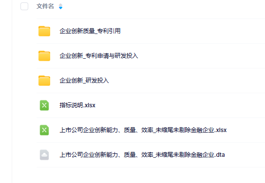 上市公司企业创新能力、质量、效率整合数据.dta;上市公司企业创新能力、质量、效率整合数据.xlsx;企业创新_研发投入数据;企业创新_专利申请与研发投入数据;企业创新质量_专利引用数据;指标说明;数据处理dofile;参考文献等