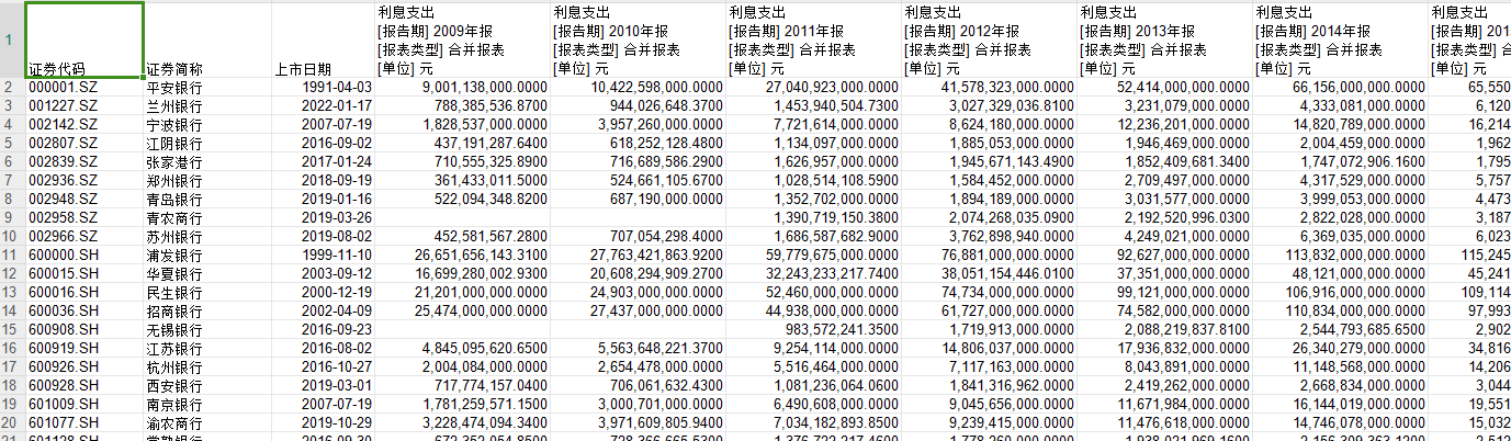 共计14个指标:证券代码、证券简称、上市日期、年份、资产总计、利息支出、员工总数、固定资产、存款总额、职工薪酬、营业支出、营业收入、扣除人员开支后的营业支出、勒纳指数