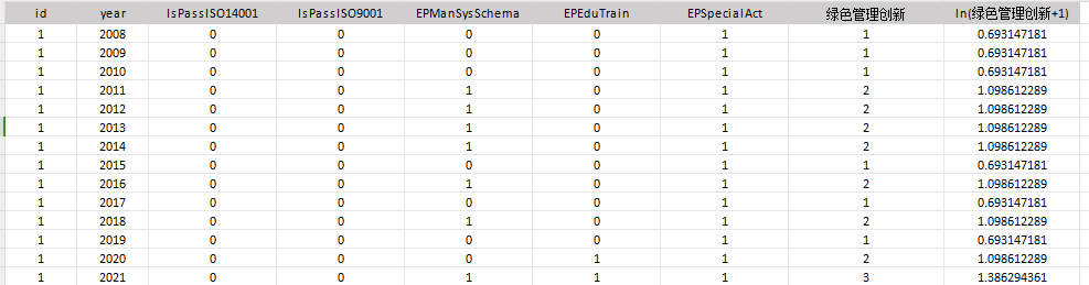 绿色管理创新主要指标:股票代码、年份、ISO14001认证、ISO9001 认证,环保管理制度体系、环保教育与培训、环保专项行动、绿色管理创新、绿色管理创新的对数