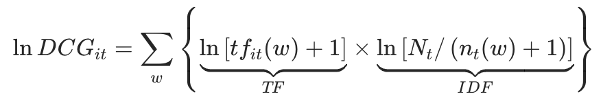 指标测度方法:早期研究采用的数字资产、电信支出、企业官网及企业邮箱等衡量指标维度过于单一,难以反映企业生产经营全链条数字赋能情况。随着机器学习方法的演进和文本大数据可获得性的提高,袁淳等(2021)、赵宸宇等(2021)、吴非等(2021)诸多学者创建了企业数字化术语词库,并利用文本分析及词频统计法测度企业的数字化转型指数。此种测算方法能够综合覆盖“底层技术架构”(即ABCD技术)与“数字技术应用”两类数字技术在企业生产经营活动中的赋能情况。但词频统计法的等权重测度原则容易导致对通用性数字技术的高估,从而忽视数字化转型对不同数字技术赋能的依赖程度。为了避免该问题,使用在机器学习下的词频–逆文本频率(TF-IDF)方法,以期更为精确地刻画中国企业数字赋能情况。具体计算公式如下: