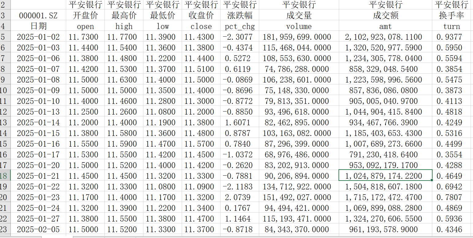 指标内容:开盘价 最高价 最低价 收盘价 涨跌幅 成交量 成交额 换手率