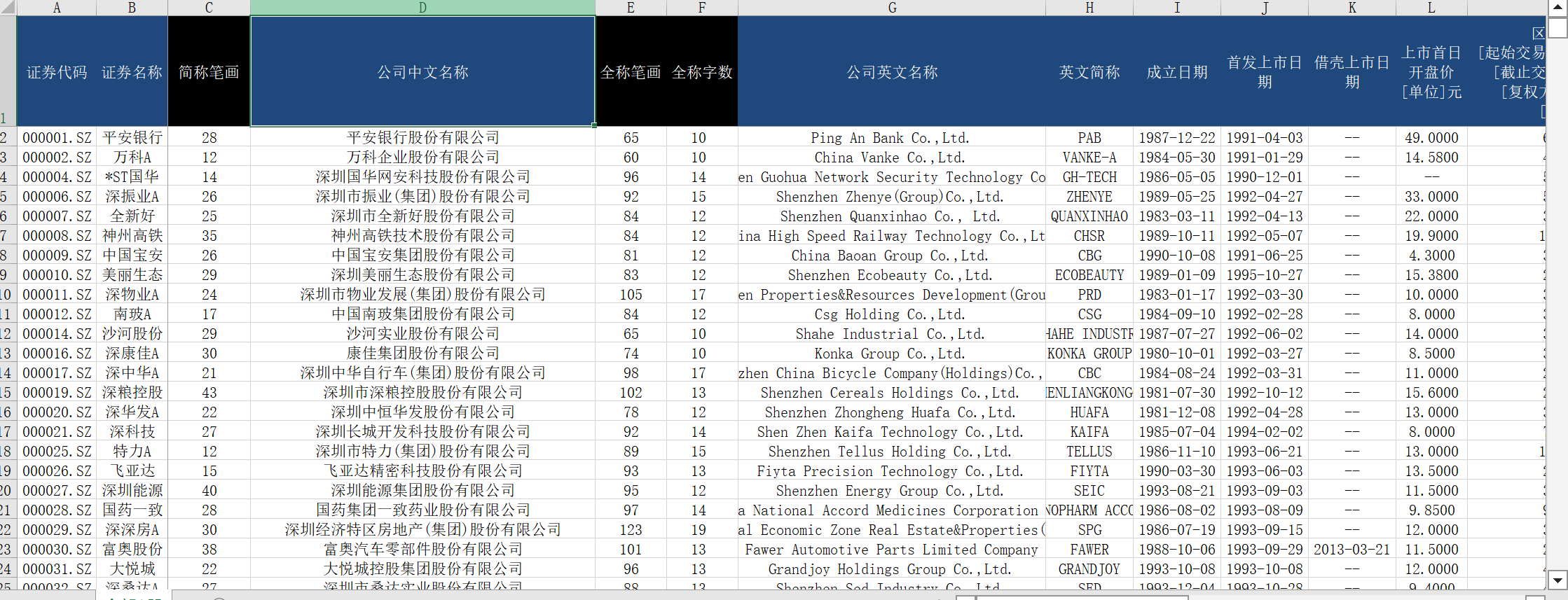 证券代码、证券名称、简称笔画、公司中文名称、全称笔画、全称字数、公司英文名称、英文简称、成立日期、首发上市日期、借壳上市日期、"上市首日开盘价、区间最高价、区间最高价日、区间最低价、区间最低价日(其中最高价、最低价、最高价日、最低价日包含前复权和不复权两类数据)
