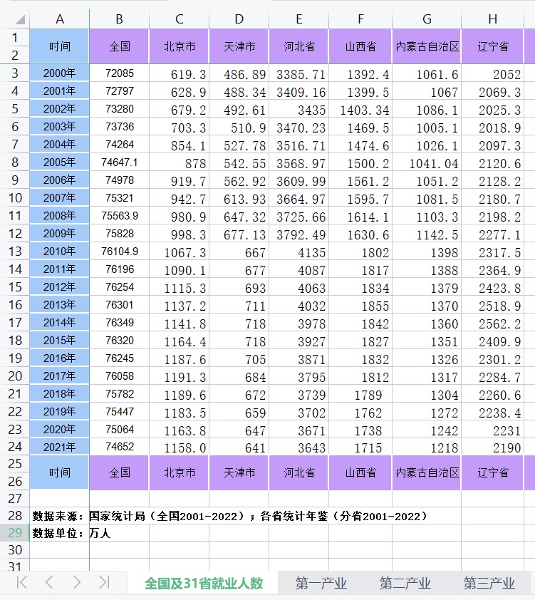 辽宁2020年统计年鉴没有区分三次产业就业人数,所以2019年辽宁有总就业人数,但无分三次产业就业人数。黑龙江省2011、2012、2013没有公布分三次产业的就业人数,所以这三年有总就业人数,但无分三次产业就业人数。其余数据均完整。