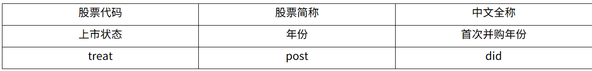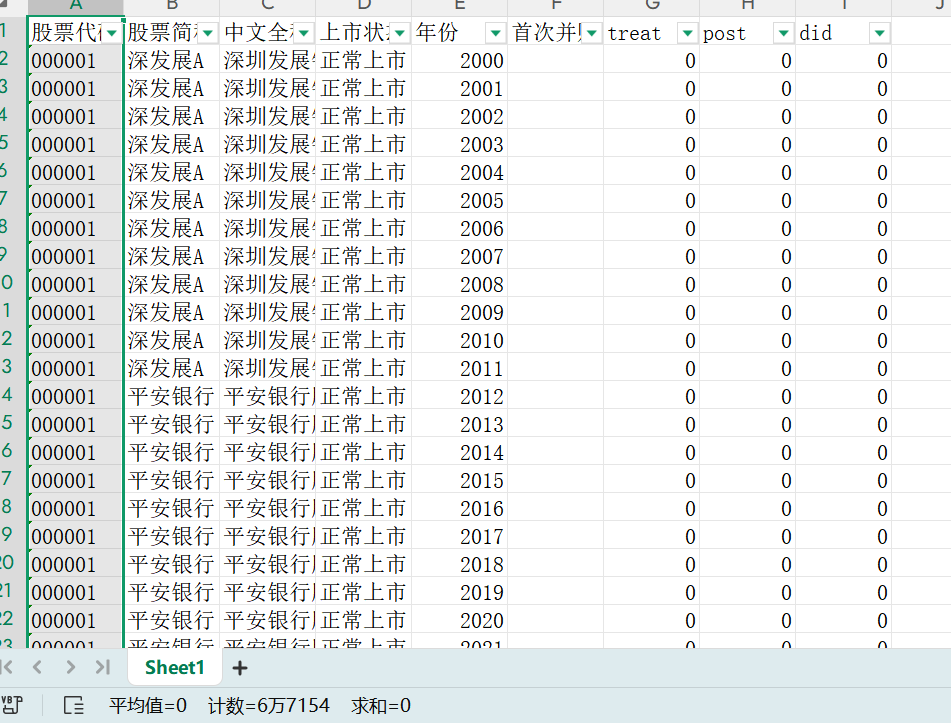 原始样本包含全部A股上市公司的并购事件记录。在样本筛选上,首先保留了连续经营4年以上的企业,再依次执行以下处理:第一,保留交易结果为成功("Y")的并购事件;第二,依据并购地区类型编码,仅保留涉及海外并购(地区类型编码含"2")的交易记录,以此剔除境内并购事件。对于同一企业存在多次海外并购的情形,参照已有文献做法,仅保留该企业首次完成海外并购的事件,并将其首次公告日期所在年份作为准自然实验的冲击年份。在此基础上,构建双重差分(DID)识别变量:处理组(treat)为样本期间内曾发生海外并购的企业,赋值为1,其余企业作为控制组,赋值为0;政策冲击变量(post)在并购首次公告年份及之后年份取值为1,首次公告年份之前取值为0,控制组全程赋值为0;核心交互项(did=treat×post)用于识别海外并购对企业绩效的因果效应。最终面板数据共涵盖67,153个企业—年度观测值,其中处理组企业287家,did=1的观测值共计2,094个。