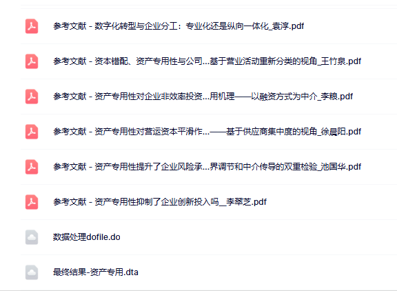 上市公司基本信息年度表_简化版.dta;数据处理dofile.do;上市公司-资产专用性.dta;参考文献 - 资产专用性对营运资本平滑作...——基于供应商集中度的视角_徐晨阳.pdf;参考文献 - 客户集中度改变了公司债务期...于供应链风险溢出效应的研究_徐晨阳.pdf