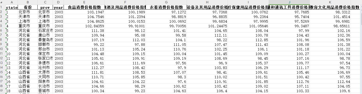 共计20个指标:year、minteg2、meg2、state、省份、prov、食品消费价格指数、烟酒及用品消费价格指数、衣着消费价格指数、家庭设备及其用品消费价格指数、医疗保健用品消费价格指数、交通和通讯工具消费价格指数、娱乐教育文化用品消费价格指数、prov1、meg、minteg、地级市、年份、市场分割指数、市场一体化指数