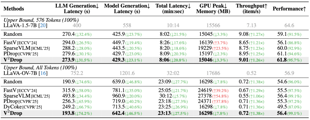 在效率层面,本方法同样带来显著收益:图文理解任务(LLaVA-1.5-7B)中,LLM 生成延迟降低 31.5%,吞吐量提升至 9.01 items/s(↑1.26×),峰值显存同步下降 3.3%;视频理解任务(LLaVA-OV-7B)中,LLM 生成延迟大幅削减 74.2%,吞吐量提升 1.38×,峰值显存降低 7.8%。与之形成鲜明对比的是,SparseVLM、FastV、PDrop 在视频场景下峰值显存分别暴增 54.8%、39.2% 和 37.8%,而本方法无需计算注意力矩阵,真正实现了加速与节存的双重收益。
