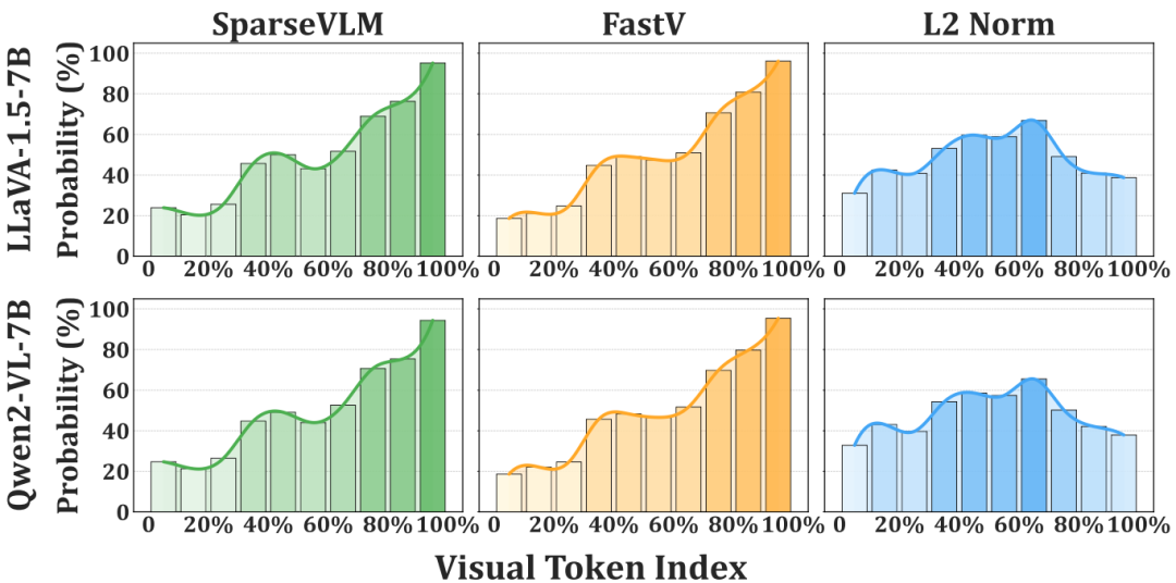研究团队在 LLaVA-1.5-7B 和 Qwen2-VL-7B 上,对比了 SparseVLM、FastV 与 L2 Norm 变化量评估在相同输入下的 Token 保留行为。注意力方法的保留概率曲线均呈单调递增阶梯形状 —— 末端 Token 保留率高达 80%~100%,前端仅 10%~30%,与内容重要性毫无关联。L2 Norm 则呈近似均匀分布,天然规避位置偏差。