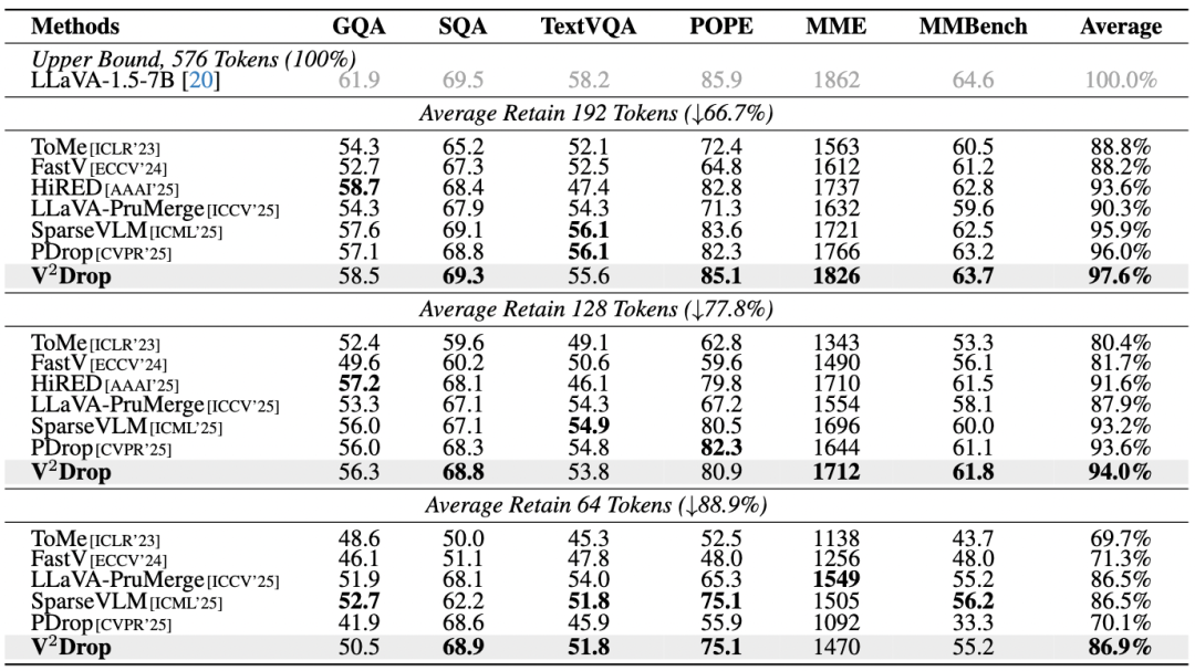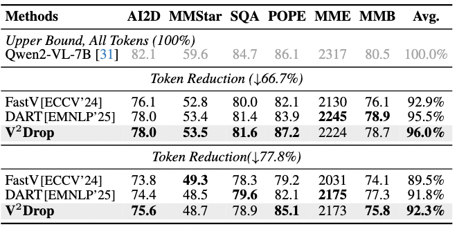 V²Drop 为视觉语言模型的推理加速开辟了一条全新路径。研究发现,视觉 Token 在 LLM 各层间的变化量与其任务相关性高度吻合,且这一规律与具体任务无关(task-agnostic)。基于这一洞察,V²Drop 以变化量为核心评估信号,构建了一套轻量、渐进、与高效算子完全兼容的 Token 压缩框架 —— 无需修改模型权重,无需访问注意力矩阵,即插即用。在图像与视频理解两条赛道上均实现当前最优性能 - 效率权衡。