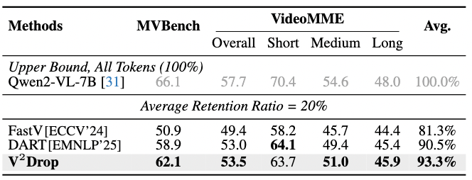 在视频场景中,本方法同样表现卓越:仅保留 25% 的 Token 时,综合性能即达 98.6%,超越保留 30% Token 的 DyCoke(97.7%),以更少 Token 实现更优性能;在长视频任务(VideoMME-Long)上持续领跑,有效缓解了 VideoLLM 普遍存在的末帧偏置问题;在 Qwen2-VL-7B 场景下,仅保留 20% Token 时综合性能达 93.3%,其中 MVBench 以 62.1 分大幅领先 DART(58.9)和 FastV(50.9),优势尤为突出。