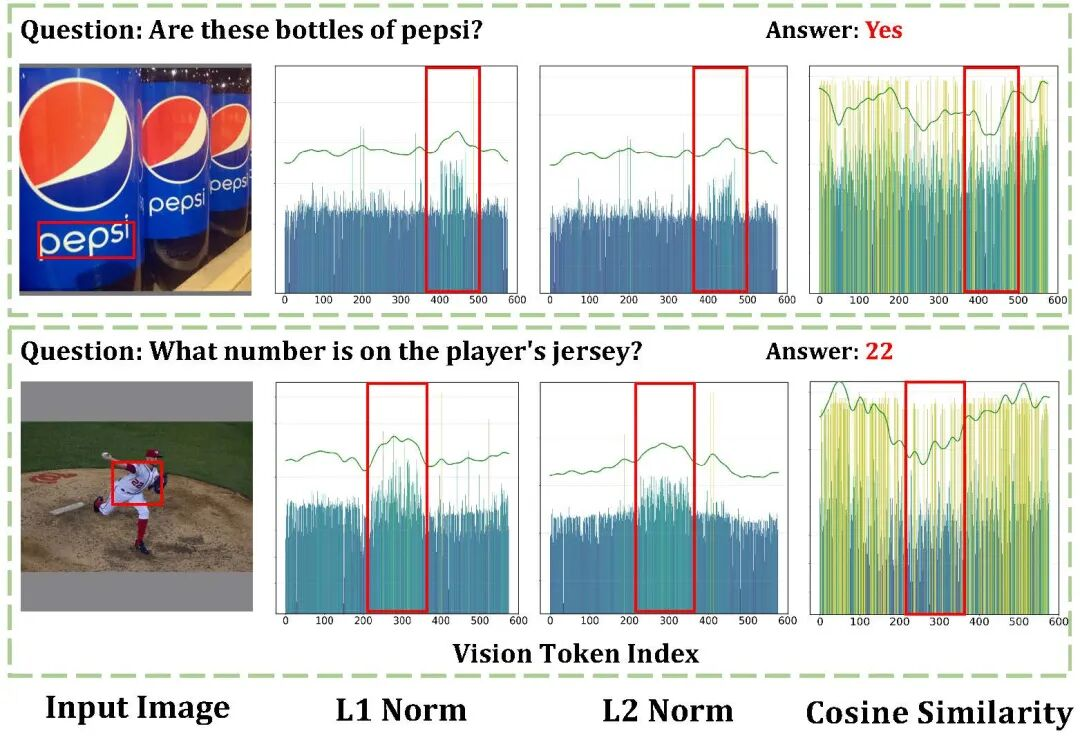 二是与高效算子存在根本性的不兼容,计算注意力权重与 FlashAttention 等高效机制之间存在本质冲突。相比之下,右侧三列(绿色边框)展示了基于 L2 Norm 变化量评估方法的显著优势 —— 其得分分布均匀、能够精准聚焦于含有关键信息的图像区域(如绿色框标注的球衣号码区域),且无需显式注意力计算,与高效算子天然兼容。