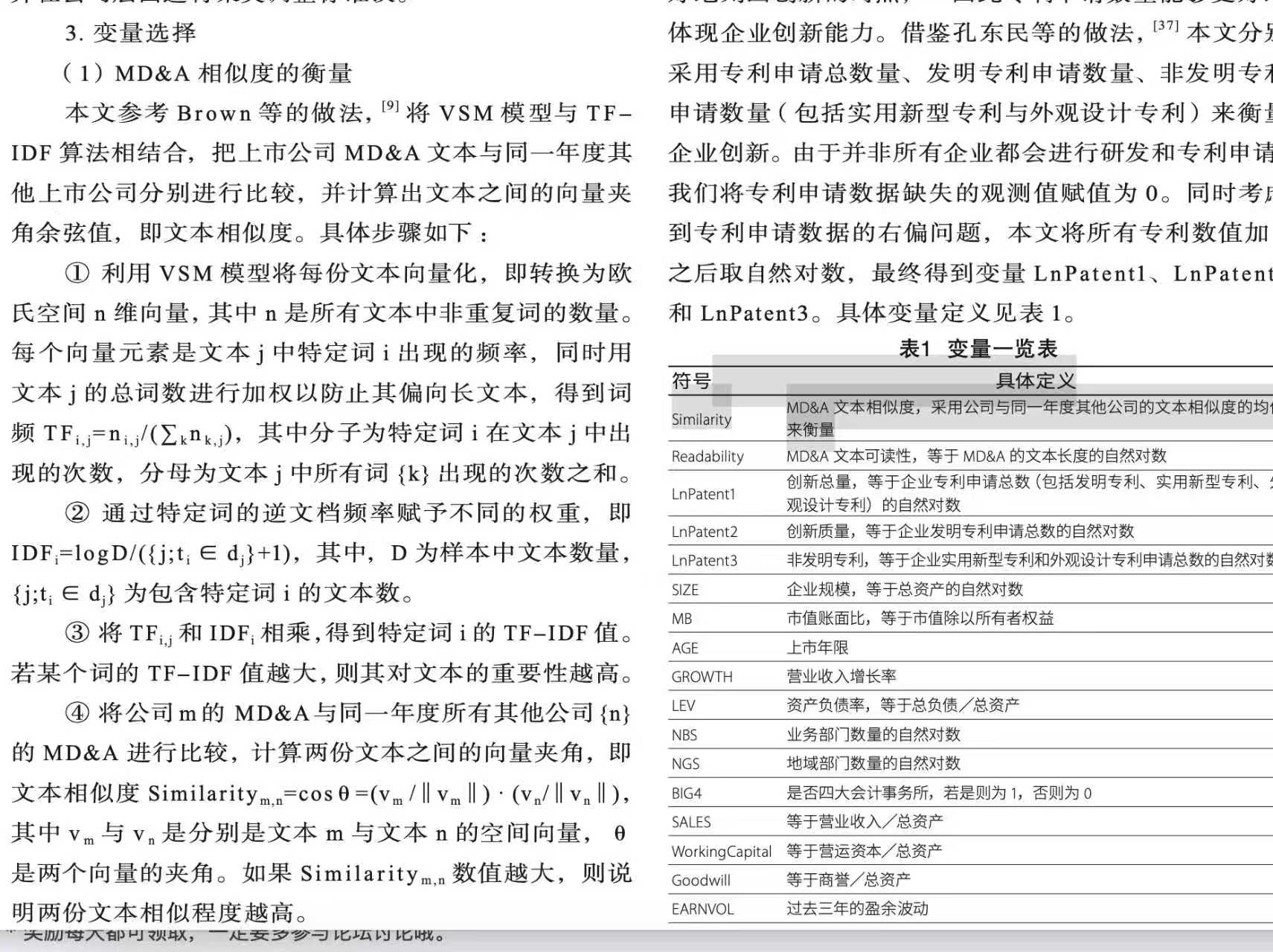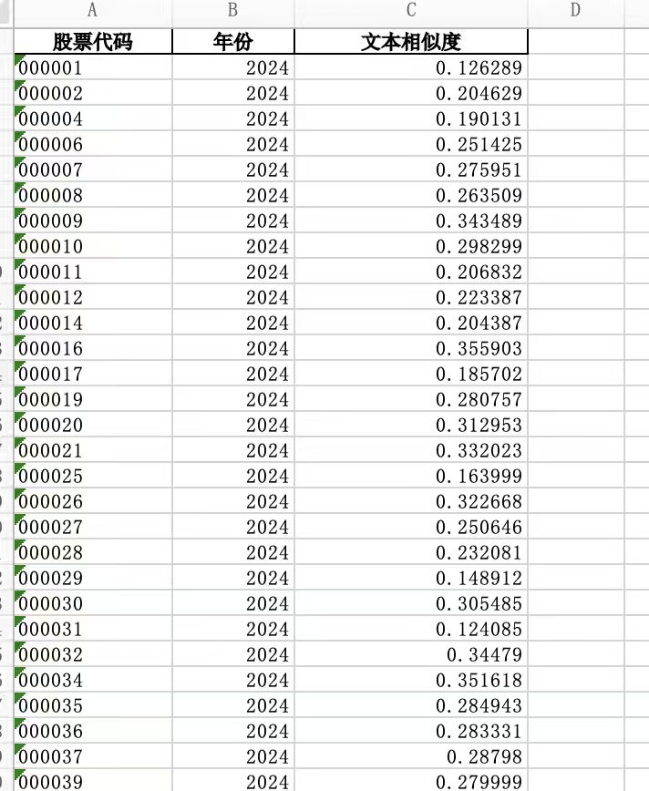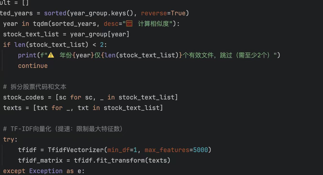 2、测算方式:参考顶刊《南开管理评论》于李胜老师的做法, V S M 模 型与 T F-IDF 算法相结合,把上市公司 M D&A 文本与同一年度其他 上市公司分别进行比较,并计 算出文本之间的向量夹角余弦值,即文本相似度。具体步骤如下 :① 利用 VS M 模型将每份文本向量化,即转换为欧氏空间 n 维向量,其中 n 是所有文本中非重复词的数量。每 个向量 元 素是文 本 j 中特定词 i 出现的频率, 同时用文本 j 的总词数 进行加权以防止其偏向长文本, 得到词频 T F i , j = n i , j /( ∑ k n k , j ),其中分 子为特定词 i 在文本 j 中出现的次数,分 母为文本 j 中所有词 {k} 出现的次数之和。② 通 过特定词的逆 文 档 频率赋 予不同的权 重, 即I DFi =log D/({ j;t i ∈ dj}+1),其中,D 为样本中文本数量,{ j;ti ∈ dj} 为包含特定词 i 的文本数。采用公司与同一年度其他公司的文本相似度的均值来衡量,具体做法及公式如下方图片所示