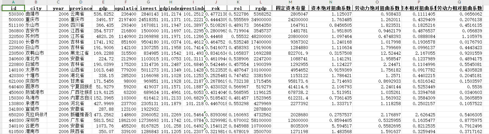 共计17个指标:id、year、rok、rol、city、province、gdp、population、invest、gdpindex、investindex、rgdp、capital、gammak、gammal、abstauk、abstaul