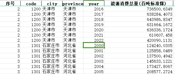 共计6个指标:序号、code、city、province、year、能源消费总量(百吨标准煤)