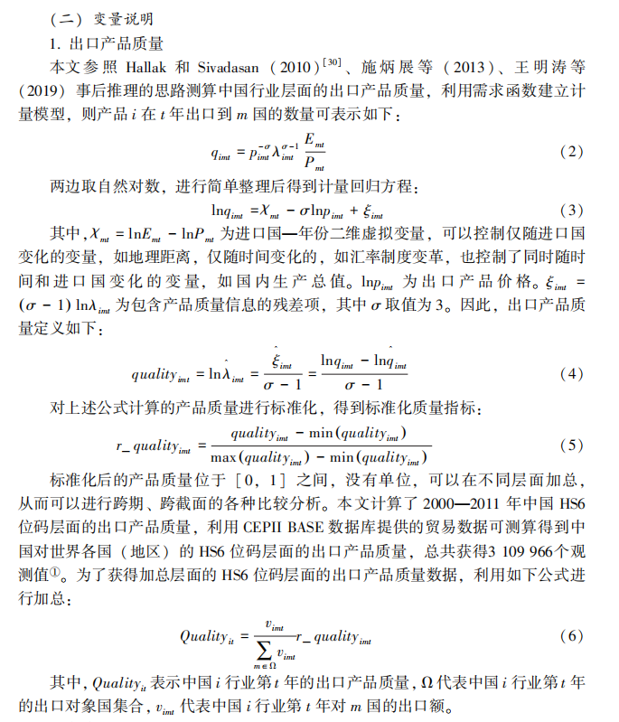 数据说明:本数据参照程锐(2020)、施炳展(2013)等学者的研究方法,通过事后推理的思路测算中国行业层面的出口产品质量, 利用需求函数建立计量模型。以quality_it进行标注,具体计量模型见图。
