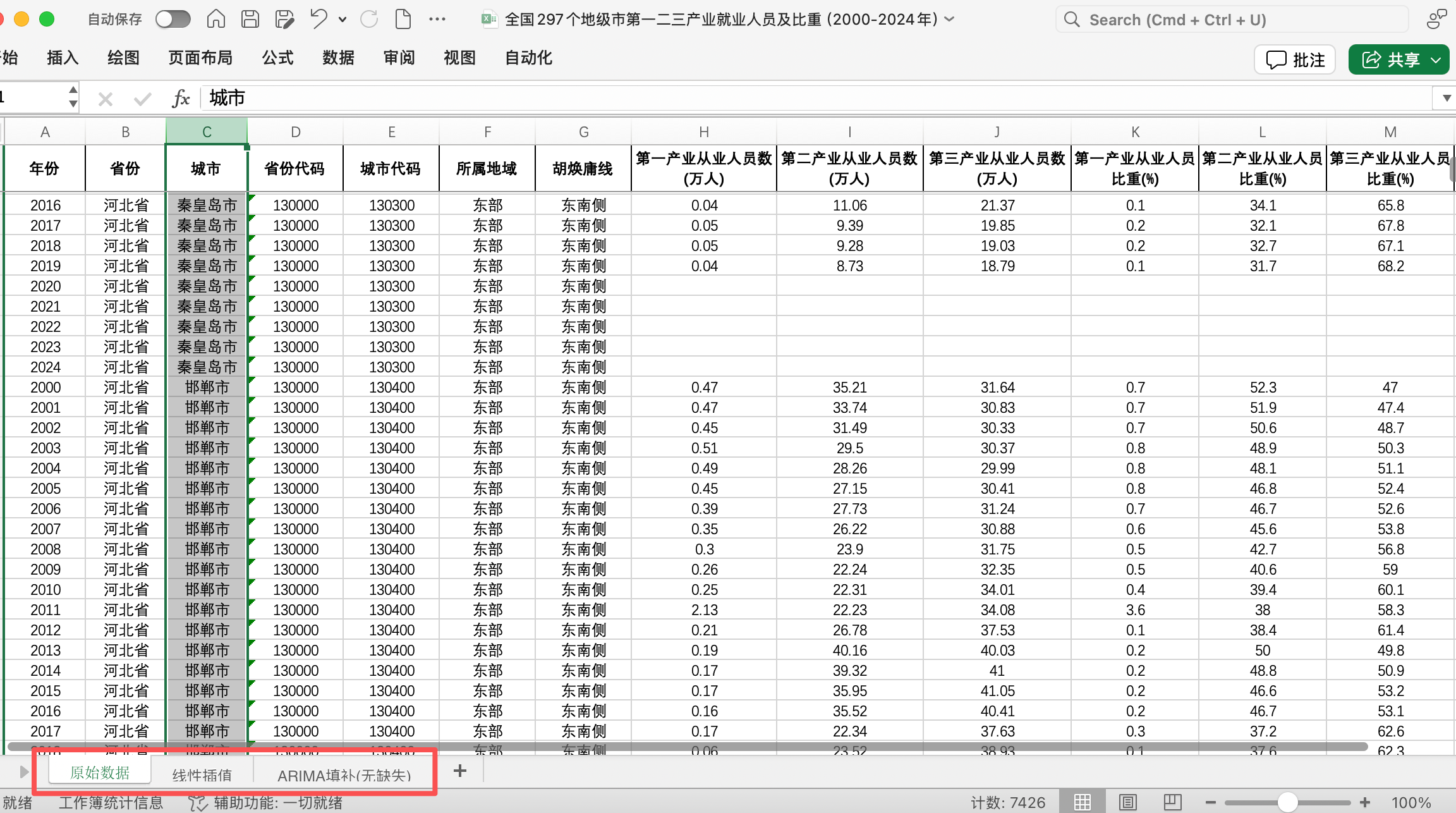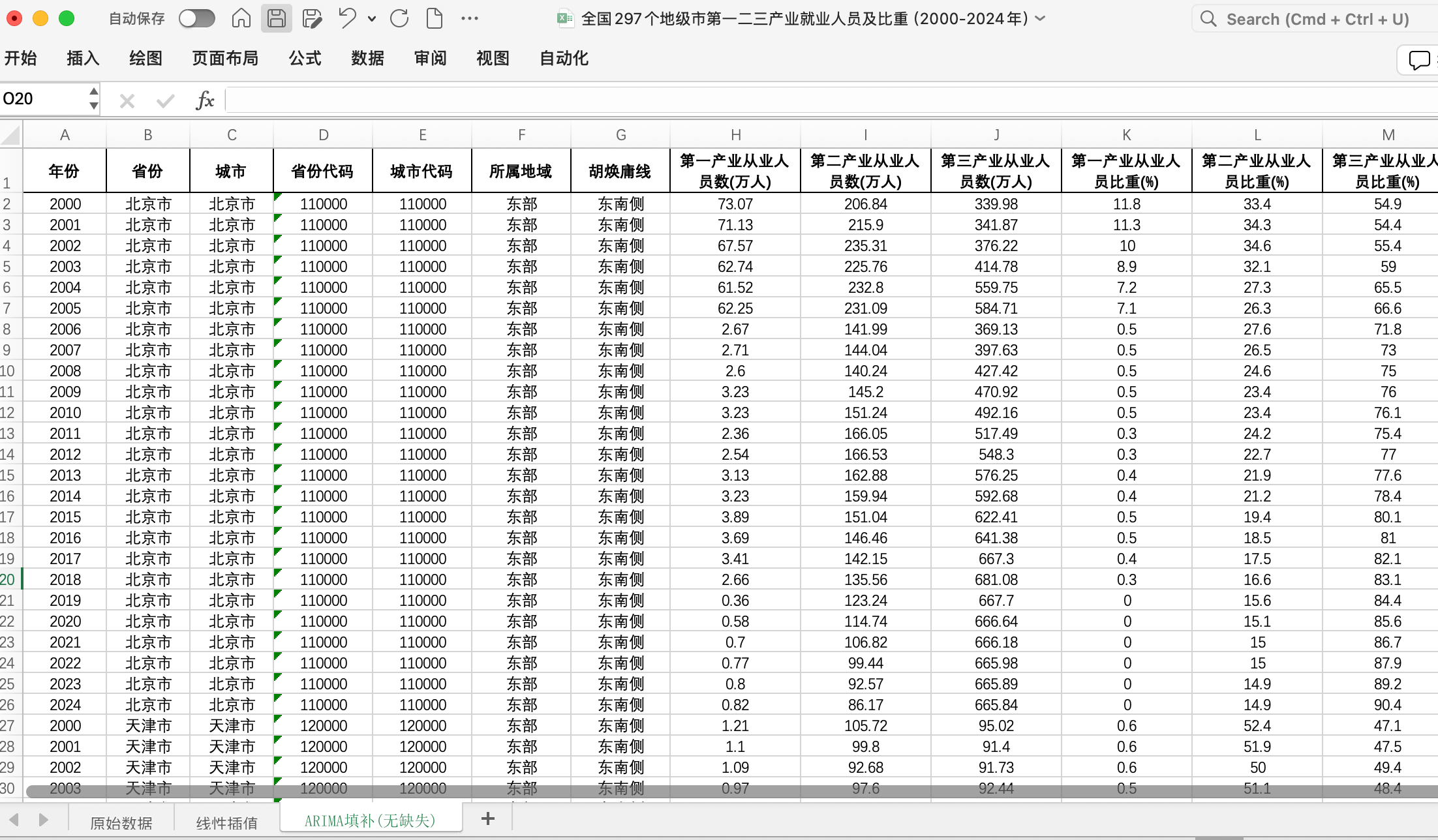 数据版本:Excel格式,含原始数据版、线性插值版、ARIMA填补版(无缺失)