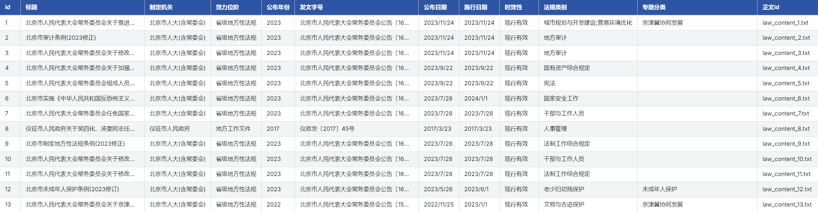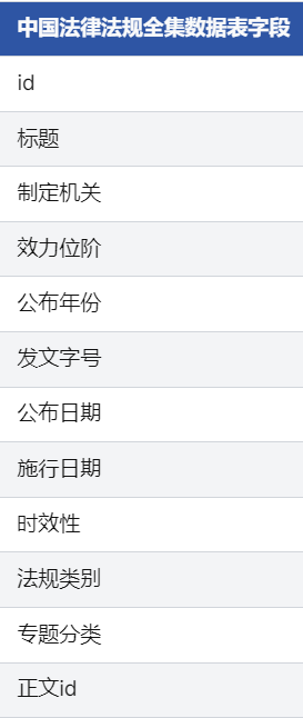 - 全文文本关联,支持深度挖掘:每条法规通过“正文id”与对应的TXT全文文本一一对应,用户可直接获取完整的法律条文。全文语料规模庞大,便于进行自然语言处理、文本挖掘及机器学习建模。