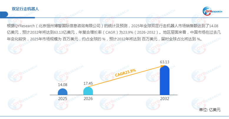据QYResearch预测,全球双足行走机器人市场规模将从2025年的14.08亿美元跃升至2032年的63.13亿美元,2026-2032年复合增长率达23.9%。这一增长受多重因素驱动:全球劳动力短缺问题加剧,工业自动化需求持续攀升;AI算法与传感器技术的突破,推动机器人成本下降与性能提升。
